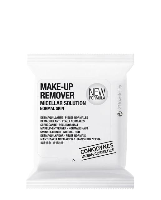 Las Toallitas Make-Up Remover Micellar Solution para piel normal de Comodynes sustituyen a la leche, tónico y desmaquillador de ojos. Eliminan impurezas y maquillaje, dejando la piel suave, limpia, tonificada e hidratada. Cada paquete contiene 20 toallitas.